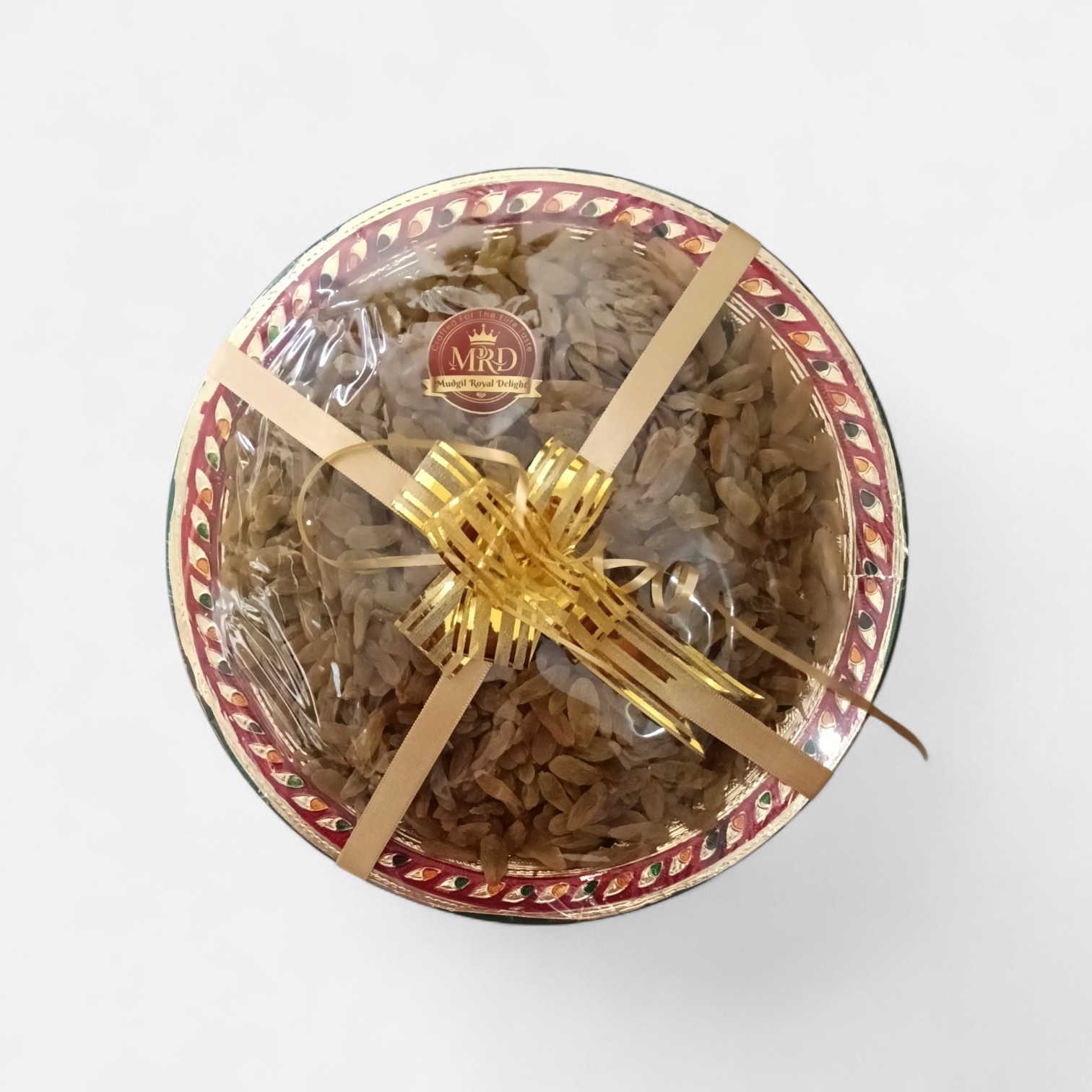 It includes a rich combination of high-quality dry fruits such as almonds, pistachios, cashews, walnuts, and raisins. In addition, each dry fruits gift tray is arranged in a decorative round box with elegant ribbon packaging, making it visually appealing and ready to gift.